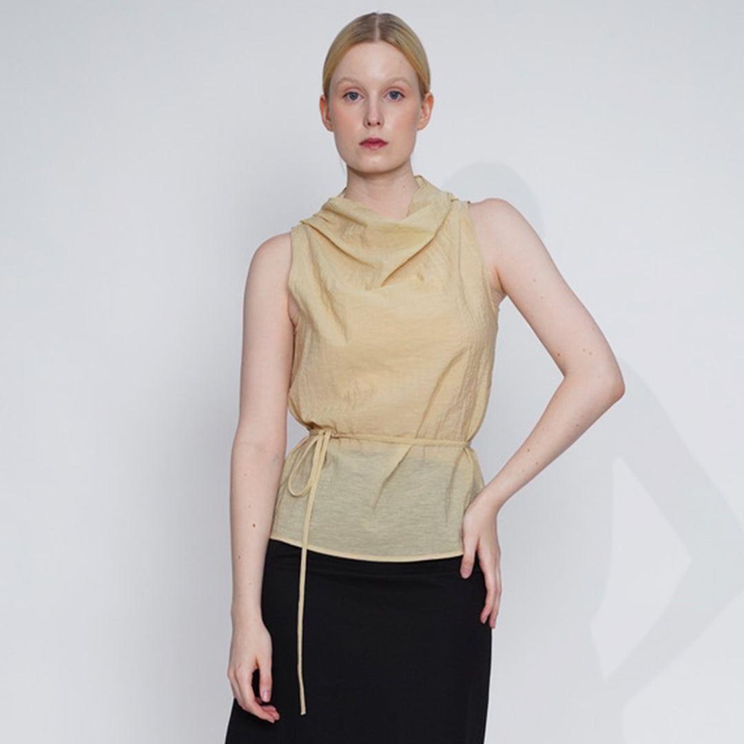 This sleeveless blouse is a sophisticated and versatile piece, perfect for a modern, minimalist wardrobe. It features a unique, draped cowl neck that adds a touch of elegance and soft volume. The blouse is cinched at the waist with a thin, self-fabric tie, creating a flattering silhouette.