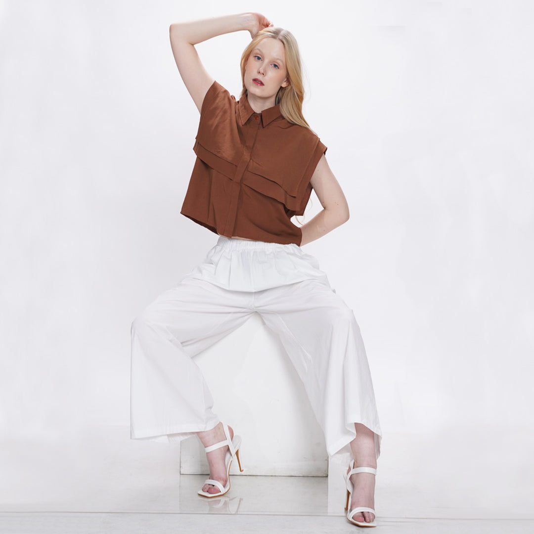 Elevate your wardrobe with our Ruffle Cropped Blouse. Crafted from crisp soft fabric, this shirt features a sharp collar and a button-down front. The standout detail is the dramatic layered ruffles that drape over the shoulders, giving it a modern, architectural feel.